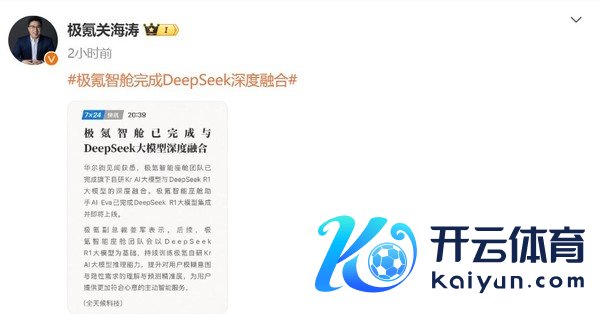 2月7日,极氪智能科技CMO关海涛布告,极氪智能座舱团队已完成旗下自研Kr AI大模子与DeepSeek R1大模子的深度会通。极氪智能座舱助手AI Eva已完成DeepSeek R1大模子集成并行将上线。