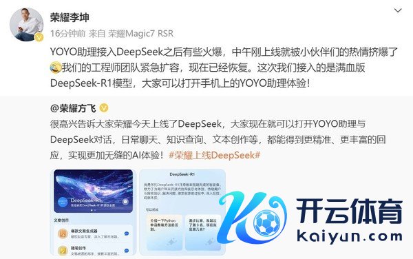 2月8日,荣耀官方布告,YOYO智能体接入满血版DeepSeek-R1,荣耀手机系统版块MagicOS 8.0及以上用户,将YOYO助理升级到80.0.1.503版块及以上即可体验。由于热渡过高,刚上线处事器就被挤爆了,荣耀工程师团队紧要扩容,快速复原。至此,荣耀成为了第一个接入DeepSeek的安卓手机品牌。
